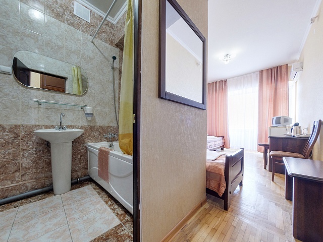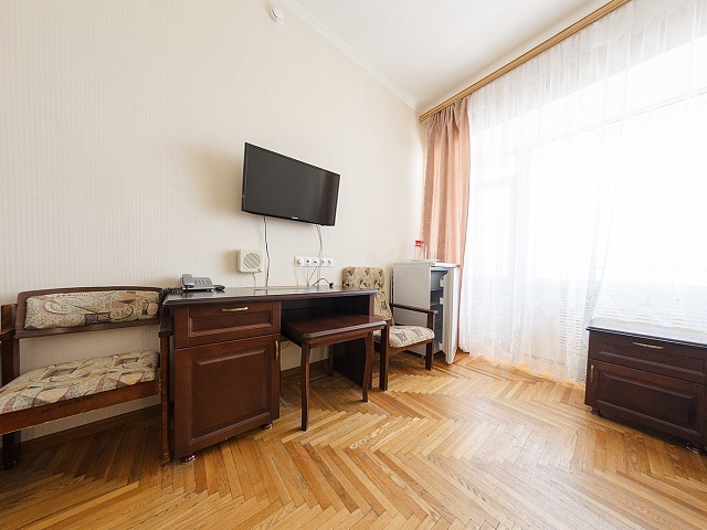 В номере: кровать полутороспальная, комплект - кресло (раскладное), пуфик, тумба прикроватная, журнальный столик, стол туалетный с зеркалом, встроенный шкаф, тумба TV, телевизор, холодильник, кондиционер, телефон
