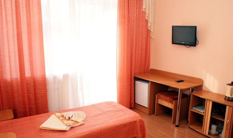В номере: мини-холодильник, одна полуторная кровать, стол, стул, телевизор, тумбочка, электрочайник, набор посуды, зеркало, вешалка