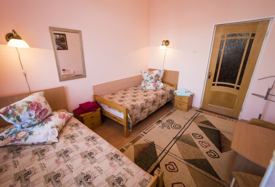 В номере: две односпальные кровати, прикроватные тумбы, встроенный шкаф, стол, кресло (или стул, или пуф), телевизор, холодильник, телефон, набор посуды